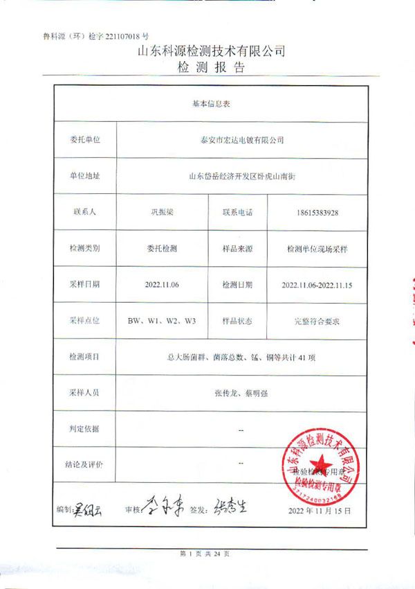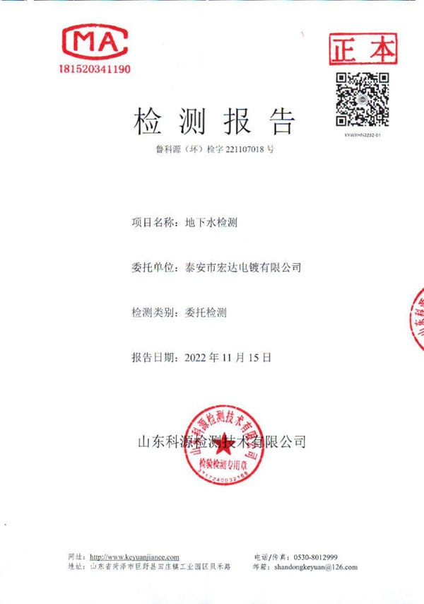 地下水22年下半年-泰安市宏达电镀有限公司 2022-12-10 本文被阅读 678 次