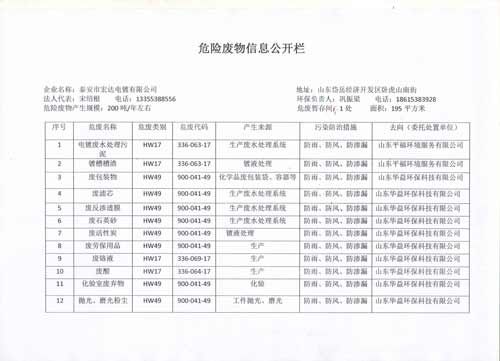泰安市宏达电镀有限公司危险废物信息公示 2023-2-1 本文被阅读 976 次
